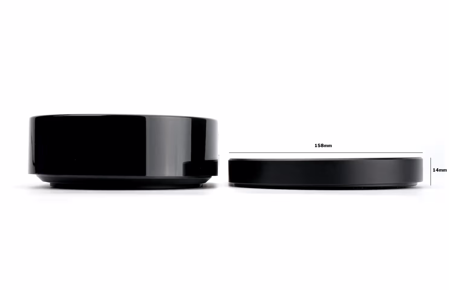 Wide enough to weigh two cups at once: 14mm (height) x 103mm (depth) x 158mm (width). The slim profile is slightly thinner than the popular Acaia scales and fits into a drip tray.
